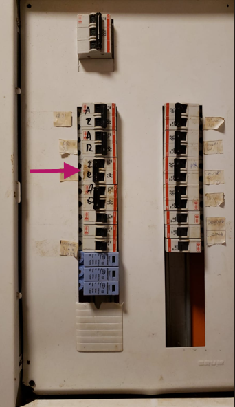 O refletor fica na área externa para iluminação de toda a área, sendo desligado dentro da casa na área da lavanderia, no quadro de energia conforme foto abaixo.